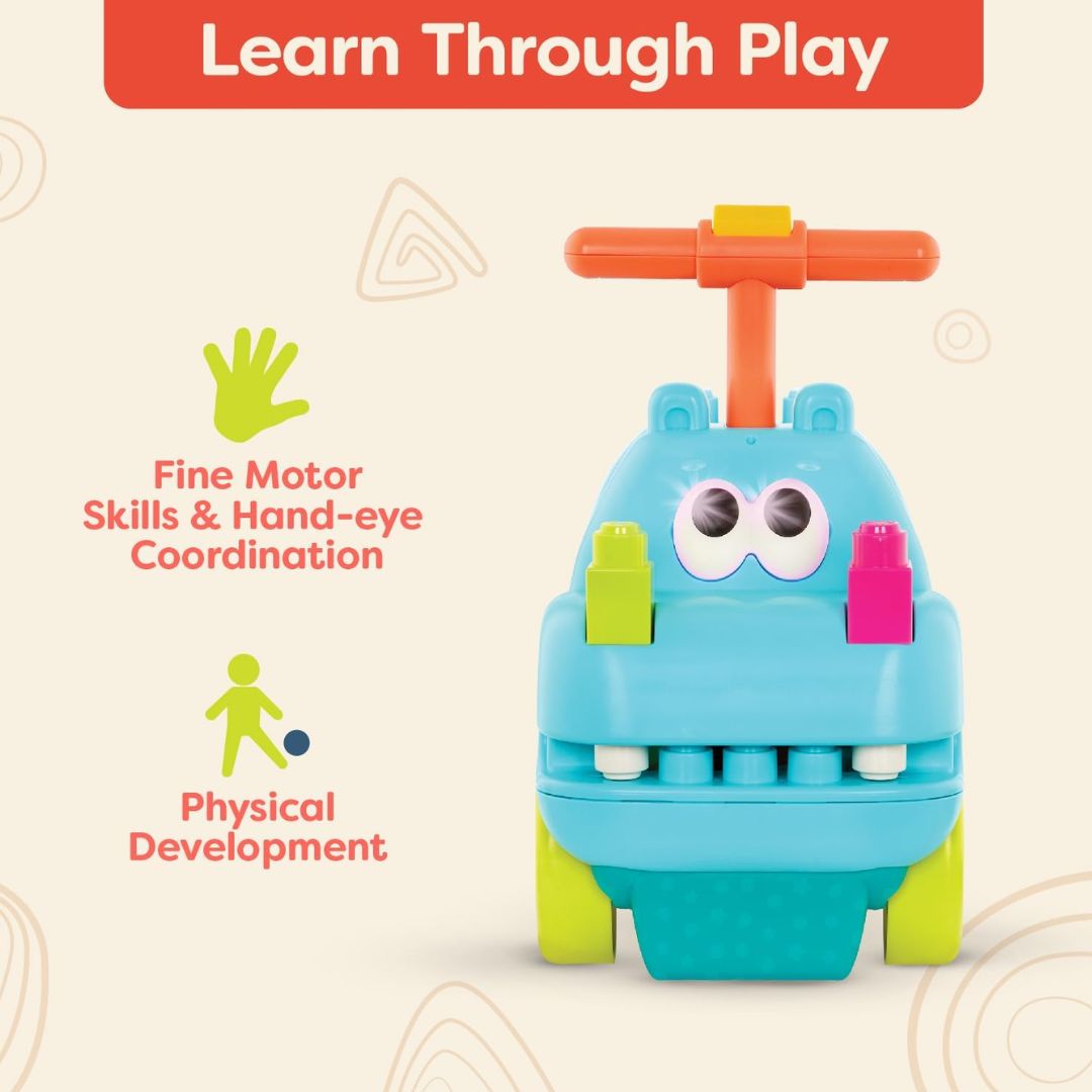 The B. Toys Ride-On Toy - Lockblock Hippo is a multifunctional playset designed for toddlers aged 12 months and up, combining a ride-on toy with colorful building blocks for interactive play.