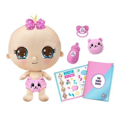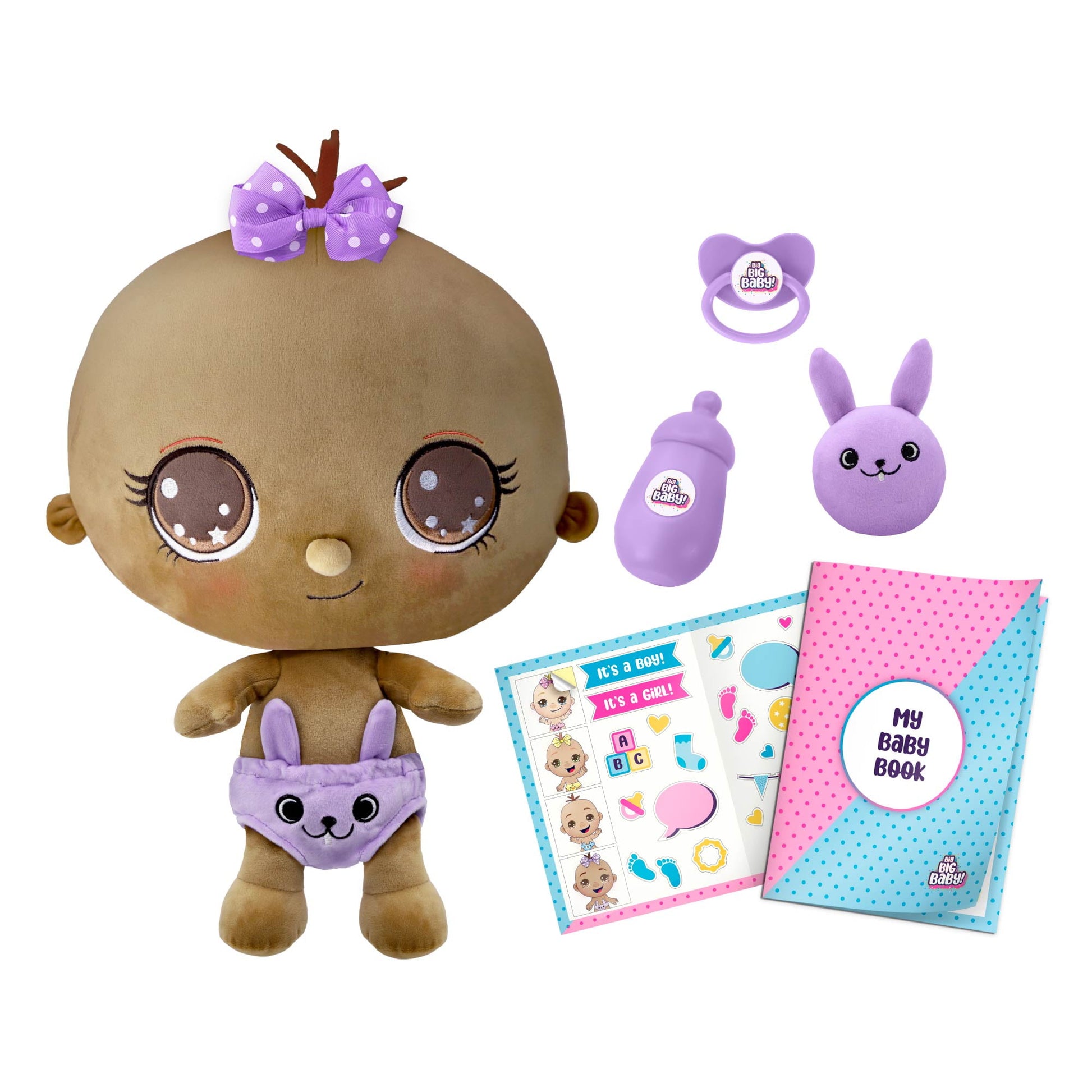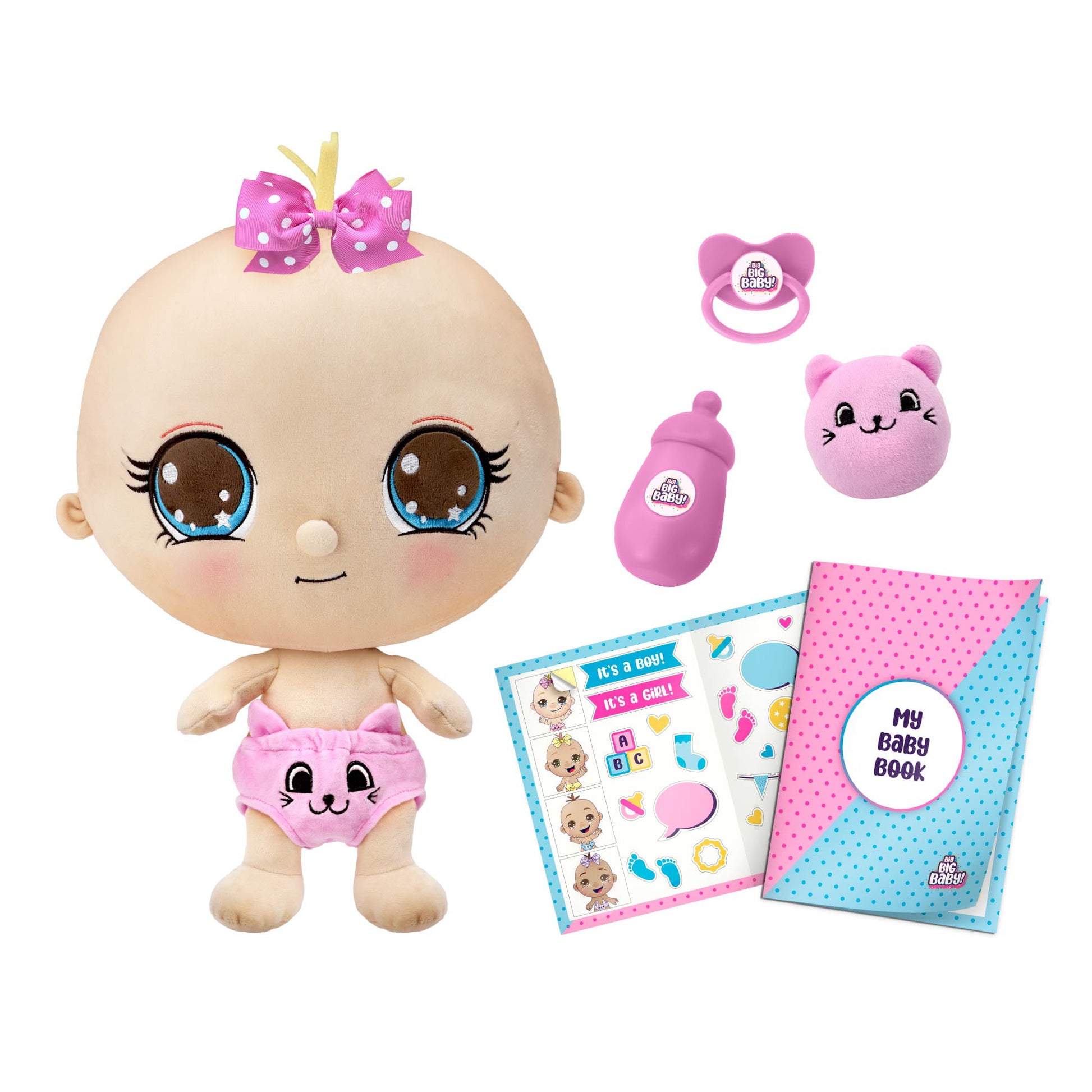 The Big Big Baby offers a super-size surprise experience for children. By pulling a magic string, the baby's identity is revealed, and then it grows up to three times its original size. This interactive doll is 18 inches tall, super soft, and cuddly. It features over 25 sounds and reactions, including giggling, burping, and crying. The package includes a removable diaper, three interactive accessories (bottle, pacifier, and toy), a baby book, and a sticker sheet. There are four different styles of Big Big Baby to collect, making it suitable for children aged 3 and up.