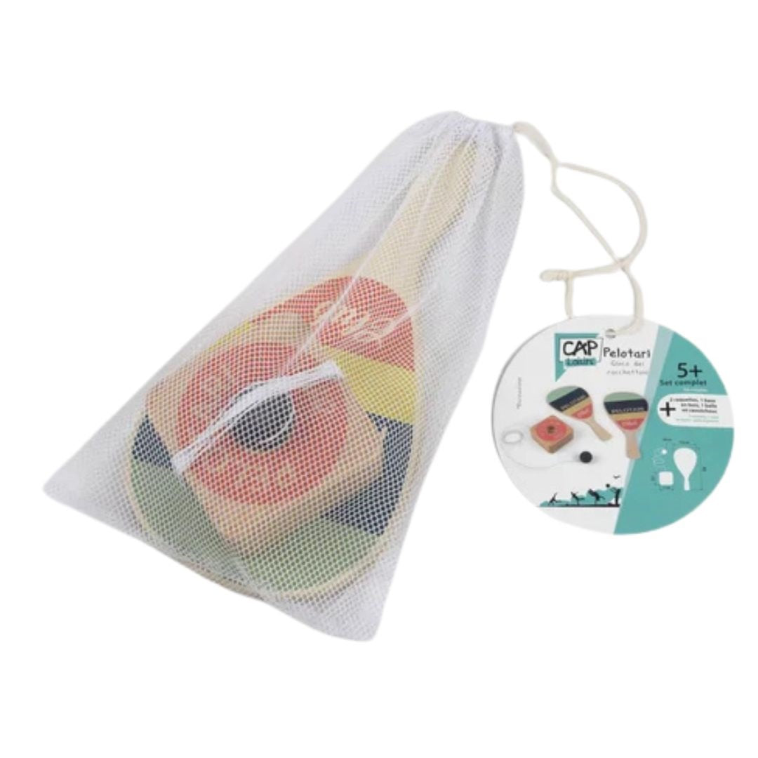 The Cap Loisir Pelotari Racket Game is a fun and fast-paced activity inspired by Basque pelota, designed for children aged 5 and up. This complete set includes a solid wood base with a rubber ball attached to an elastic cord, two wooden rackets, and a convenient mesh bag for storage. Ideal for developing reflexes and coordination, the ball can be neatly stored in the base for easy transport.