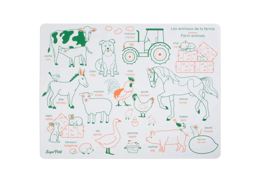 Super Petit presents an engaging set designed to captivate children, perfect for enjoyable moments. With its reusable silicone coloring surface, coloring becomes effortless and enjoyable. Crafted entirely from 100% food-grade silicone, the product guarantees safety and is complemented by a non-porous antibacterial surface, ensuring a secure environment for your little ones. The set includes a convenient silicone marker, along with 5 additional markers and a holder, all easy to clean. Unleash creativity and embark on an adventure in Animal Farm with this imaginative coloring set.