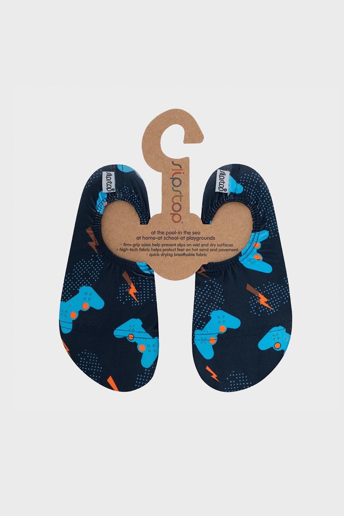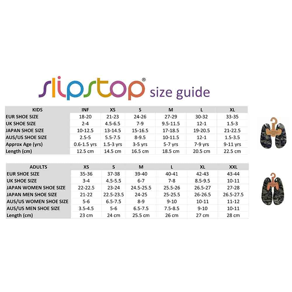 High tech soles protect feet on hot sand & floors and provide protection from infection such as verruca's. Light & flexible design makes Slipstop super easy to swim in. Sun Safe UPF50+ protection for hours of outdoor fun! Quick drying, breathable fabric gives a wonderful barefoot feeling to wear all day. Elasticated stretchy fit allows children to easily wear and take off themselves and helps keep out sand & pebbles. Reinforced front helps protect those precious toes from sharp objects and rough floors. Unique patented design in many exclusive fun and colourful Slipstop prints. Designed for all ages from baby to adult ensuring we have the whole family covered. Ensure that it is purified from sand, sunscreen and all other cosmetics Do not use washing machine, tumble dry, hot water, detergent and bleachers Harsh chemicals especially excessive amount of chlorine used in pools may damage the product (weakens the elastic fabric causing deterioration and colour fading) Make sure that the product is rinsed well under water to minimize the effects Do not store wet in a plastic bag Dry flat in shade, do not hang in direct sunlight Do not dry clean Do not iron Prints which came out of an industrial process and fluorescent colours may fade faster because of direct sunlight, chlorine and salt water Depending on the usage and friction, contact with rough, bumpy surfaces, sand, rocks and sharp objects may damage the woven fabric and/or the filament and create tears in the soles of the shoe