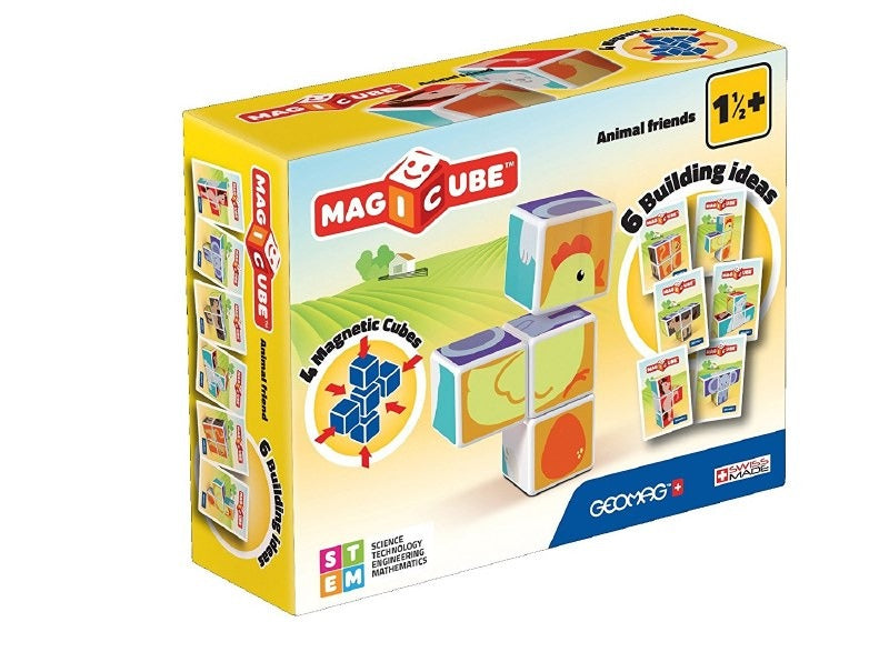 This magnetic engineering set includes four magnetic blocks with six different building ideas, allowing children to construct various animals like a chicken, cat, dog, horse, bear, and an elephant. The Magicubes in this set connect on all sides, promoting creativity and fine motor skill development. Geomag's award-winning STEM toys aim to foster imagination and curiosity in children of all ages through the science of magnetic construction. Each year, they introduce new and innovative products to entertain and stimulate young minds. Safety is a top priority for Geomag, and their manufacturing complies with rigorous European and international safety standards. They closely monitor each production phase to ensure their products adhere to the highest safety standards. Specifications for this set include four magnetic cubes with graphics on all sides and three task cards with building ideas. It is recommended for children ages 18 and up. A warning is included about the presence of strong magnets and the need to keep them away from sensitive devices like credit cards, computers, magnetic media, and medical devices like pacemakers.