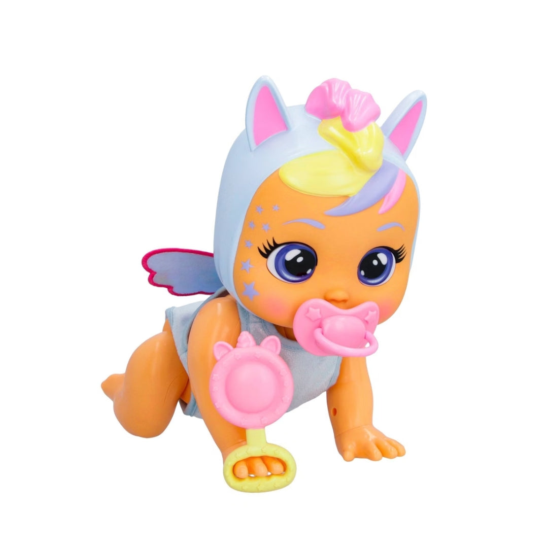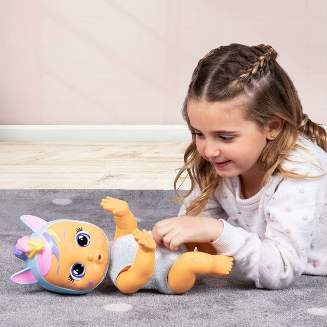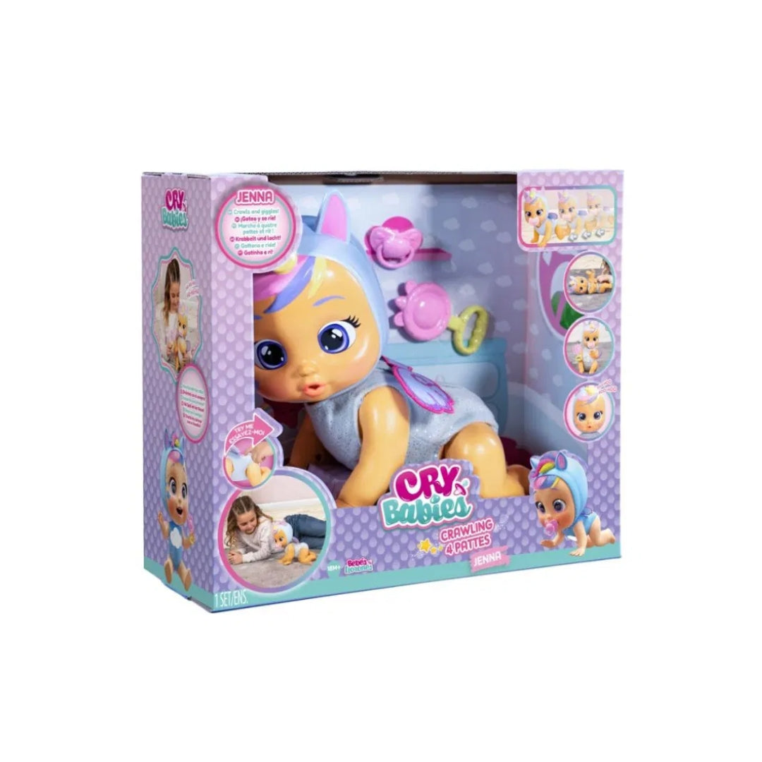 The new Cry Babies Crawling Jenna moves like a real baby, with crawling actions, giggles, and interactive responses. Press the cloud button on her back to make her crawl. When she is lying down and tickled, her arms and legs move as she laughs. Sit her up and place the rattle in her hand to see her play with it. She features painted eyes and hair and comes dressed in unicorn themed pajamas. The set includes her pacifier and rattle. Like other Cry Babies, she produces real tears when the pacifier is removed and stops when it is returned. She includes 35 realistic baby sounds.