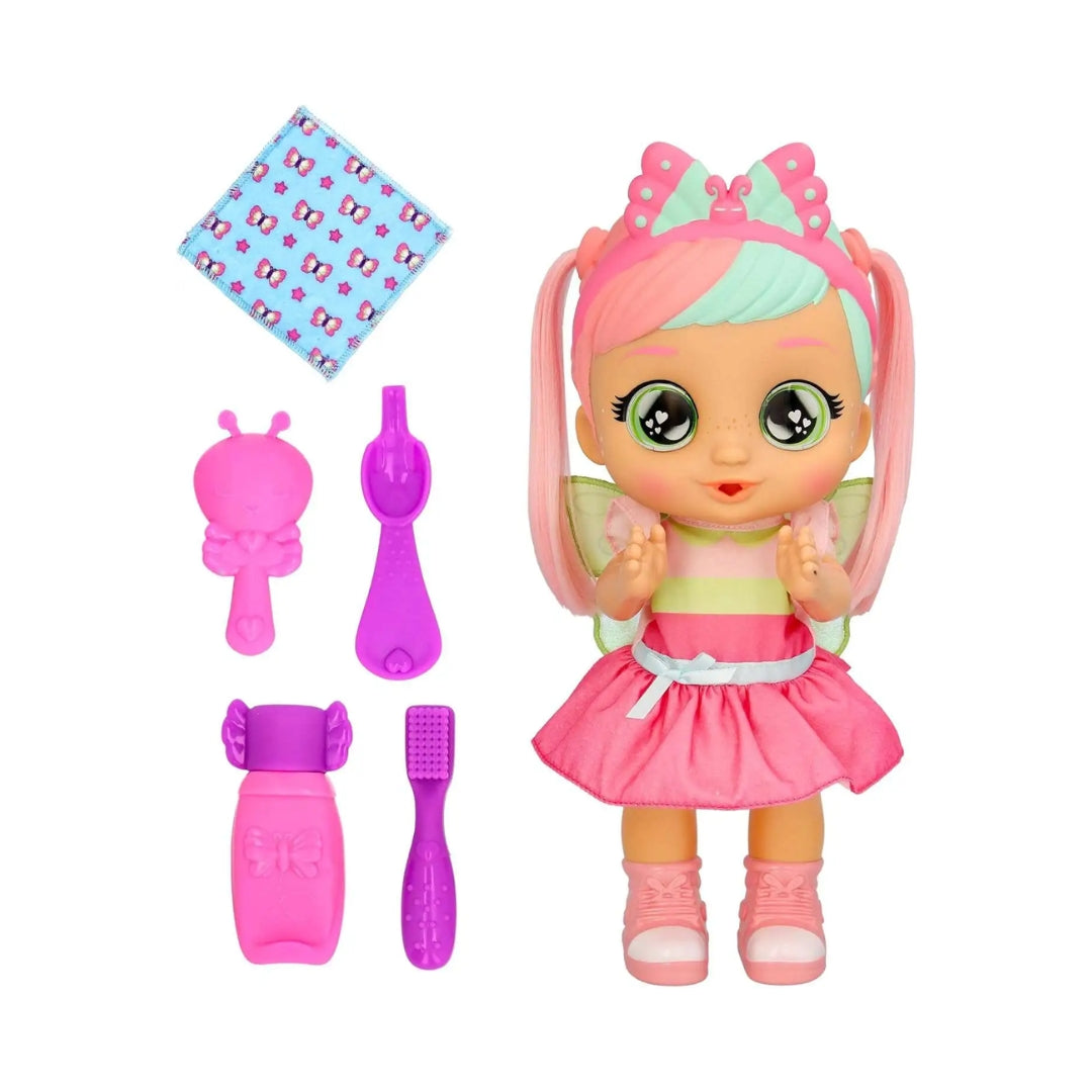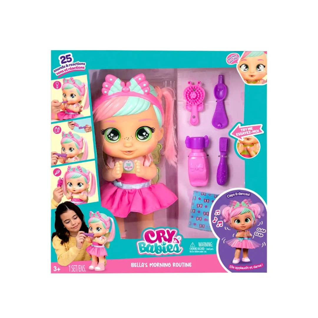 This interactive doll claps and dances when activated and features an expressive face with light up eyes. She makes a variety of sounds and sings a song. The set includes accessories for role play such as a comb, toothbrush, spoon, towel, and toothpaste. The 34 cm articulated design includes two style able pigtails. Comes with 3 LR6 batteries.