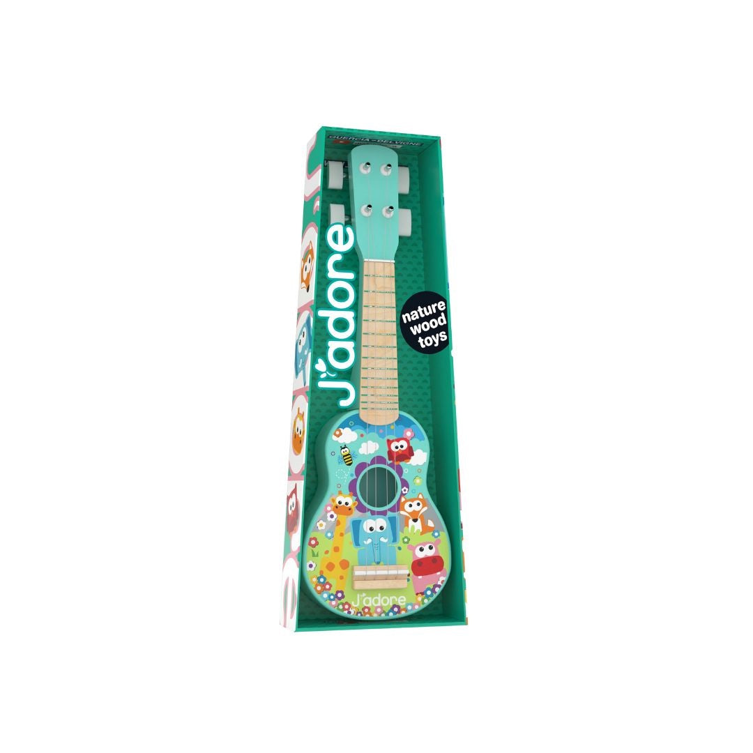 The J'Adore Ukulele Guitar Musical Instrument for kids, designed to foster musical exploration. Made from natural wood, it is perfectly sized for little hands and features fewer strings than a standard guitar, making it easier to learn.