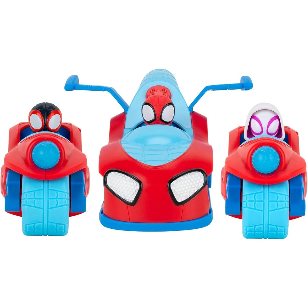 Jazwares Marvel Spidey and His Amazing Friends Spidey Team Split Racer – 8.5-Inch Three-in-One Vehicle is an interactive, show-inspired toy featuring Spidey, Spin, and Ghost-Spider, with transforming vehicles, sound effects, and action-packed web dart launchers for imaginative play.