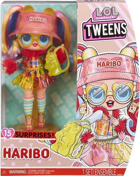 LOL Surprise Haribo Tween fashion doll has teamed up with the popular LOL Surprise! brand to bring sweet surprises to the world of Tots and Tweens dolls. The HARIBO Tween fashion doll is part of the larger LOL Surprise! series and represents a stylish and eye-catching figure with unique hair and fashionable outfits. The package is filled with exciting surprises, and it includes a HARIBO-themed Tweens fashion doll. With a delicious HARIBO candy theme, this doll is approximately 15 cm in size and is recommended for kids aged 4 and older. It's a delightful addition for fans of both brands.