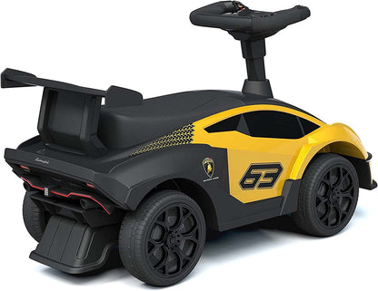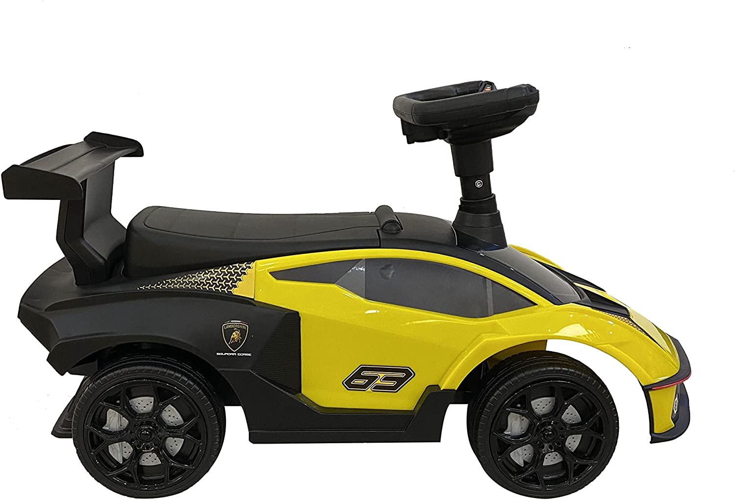 Unique foot-to-the-floor configuration -The Lamborghini SCV is a pedal-driven car with a foot-to-the-floor configuration. This enables the children to improve their balance, agility, and motor skills at a young age. It could be exactly what they need to get moving. Authentic Driving Experience -Your child will enjoy a genuine driving experience in our officially licensed Lamborghini SCV Push car, which features a realistic steering wheel, in-built music sounds, horn, and a comfy seat with a backrest. In-constructed capacity limit -The secret extra room under the seat guarantees that your little one can stack his bites, toys, story books and different miniatures while cruising all over the area. Safety Assurance: The Lamborghini SCV push car is designed with a low seat which will help your little one to get on/off the push car easily and anti-roll will increase the stability, prevent from falling and provide a secure ride. tem Dimensions: 25.5 Inches Long X 14.6 Inches Wide X 14.6 Inches Wide