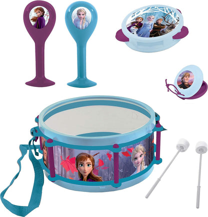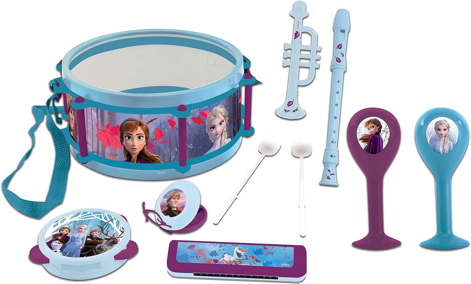 Lexibook Disney Frozen Elsa Anna Toy, a set of 7 music instruments in purple, blue, and white colors. This comprehensive music set includes a drum with a pair of sticks, a pair of maracas, a castanet, a tambourine, and three wind instruments: harmonica, recorder, and trumpet. Ideal for budding musicians, this complete set provides a convenient and portable gaming experience, encouraging exploration and enjoyment in the realm of music.