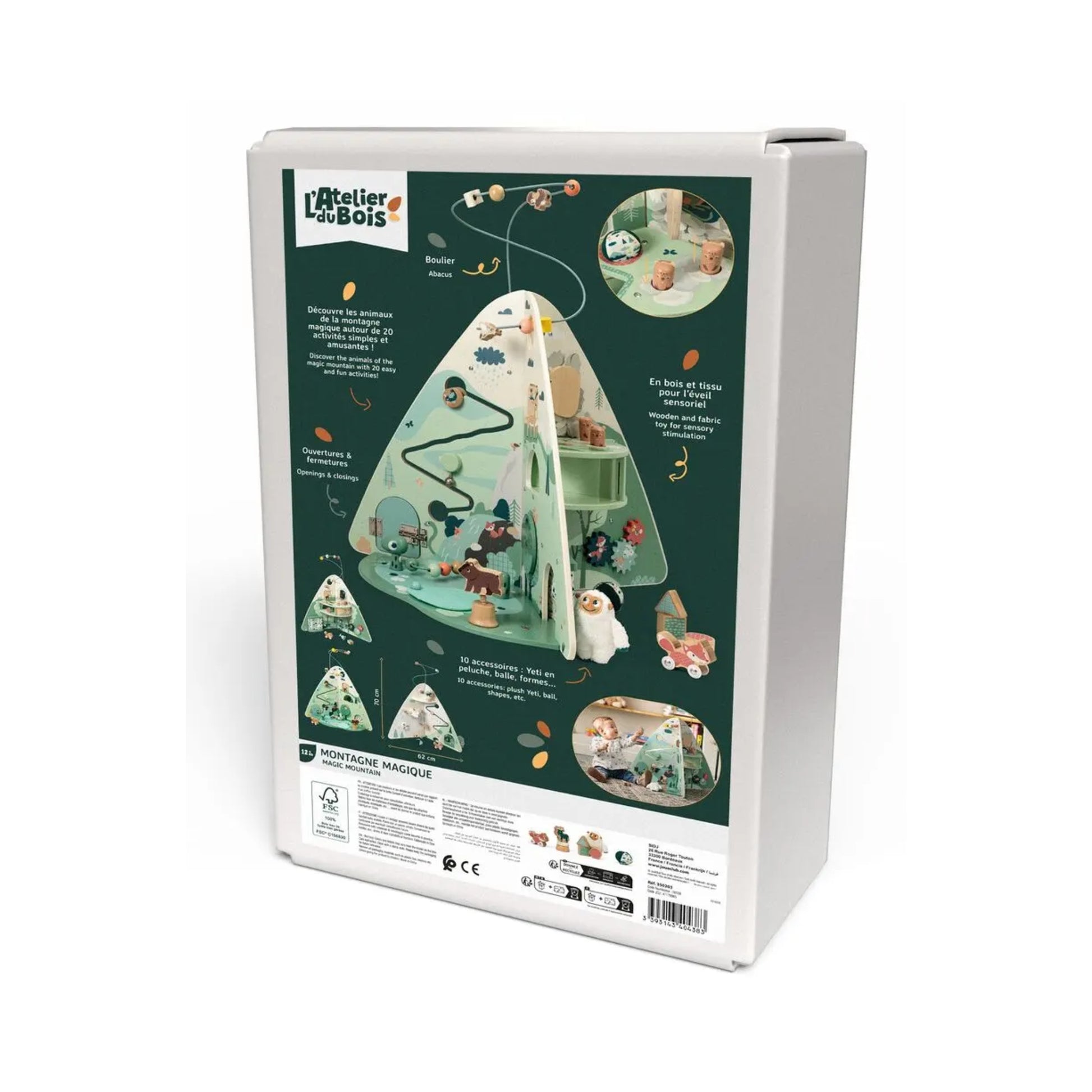 The set includes 10 interactive accessories and multiple activities, such as a rolling fox, plush Yeti, screw-on bear, mirror, felt blanket with crinkly paper, spinning tree with four hidden animals, Loch Ness Monster with abacus, opening door with latch, bell, rolling bird slide, fabric door with Velcro, mix-and-match animals, click button for the marmot, Yeti hammock, squirrel with spike, Dahu stacking tower, gears, marmot swing, shape sorter with three shapes, fabric ball, hidden dragon, and a giant abacus. This sensory activity mountain is ideal for developing coordination, problem-solving, and imaginative play in a safe, engaging environment.