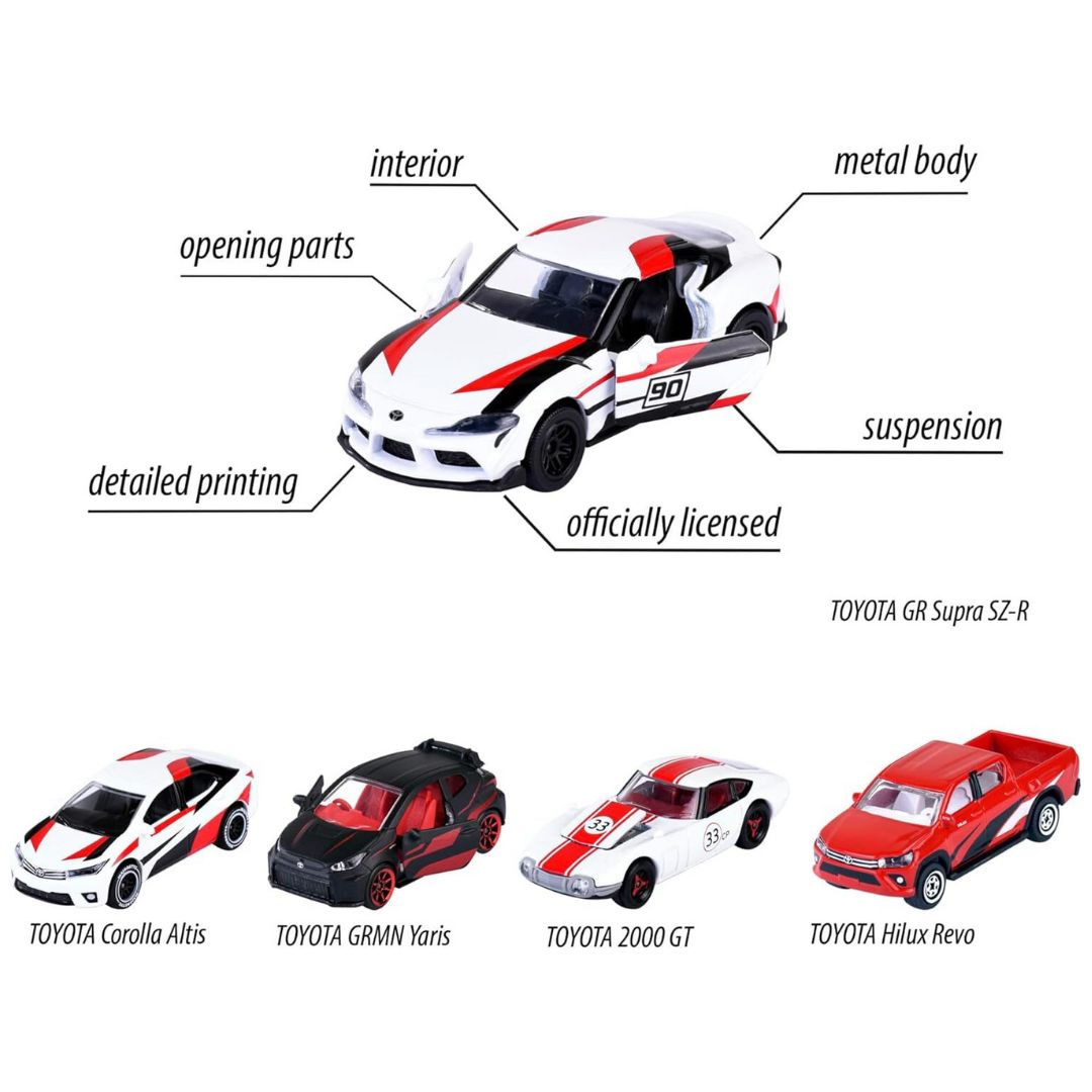 The Majorette Toyota Racing Giftpack includes five free-wheeling metal vehicles, showcasing Toyota racing models in 1:64 scale.