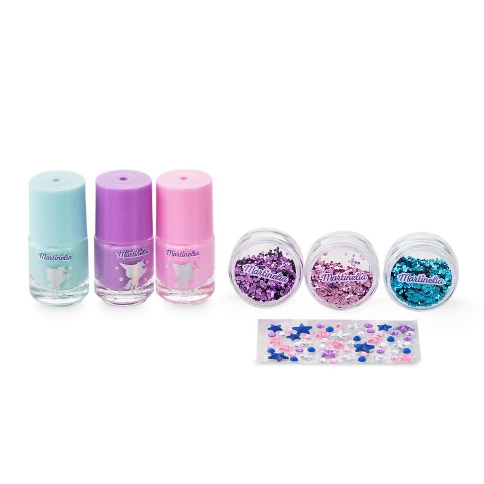 The "Shiny Nail Galaxy Dreams Martinelia" is a nail beautification set designed to impress, featuring three colorful nail polishes, three pots of assorted glitter and rhinestones, and it has been dermatologically tested. Each nail polish in this set weighs 4 ml. The dimensions of the product are 13 x 2.5 x 14 cm. However, it's important to note that this product should not be used by children under 3 years of age, and adult supervision is recommended. Caution is advised as it contains small parts that could be swallowed and should be kept away from the eyes. If any signs of irritation appear, it should be discontinued. The product should be stored between 5-25 degrees Celsius with the lid securely closed.