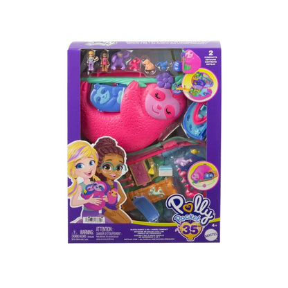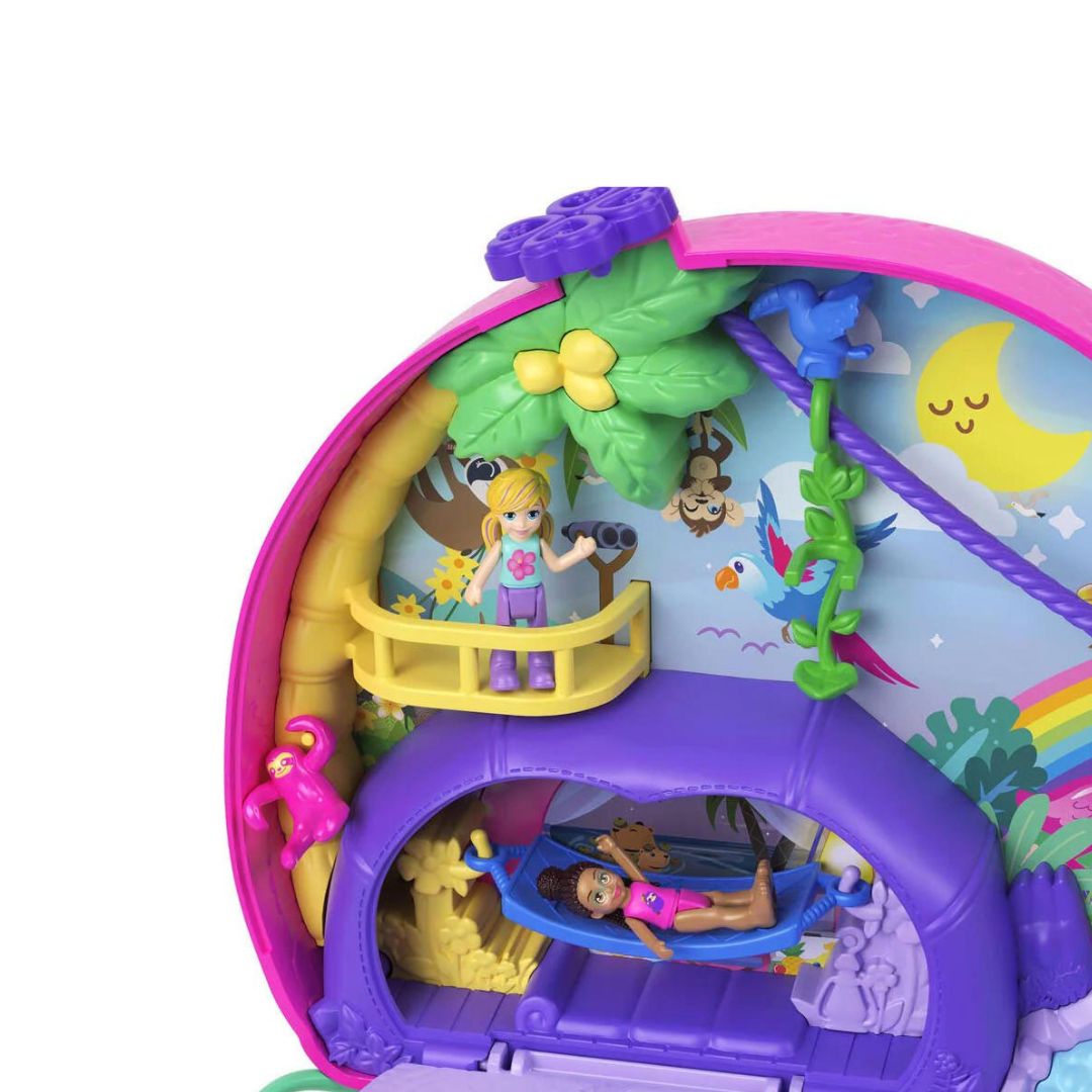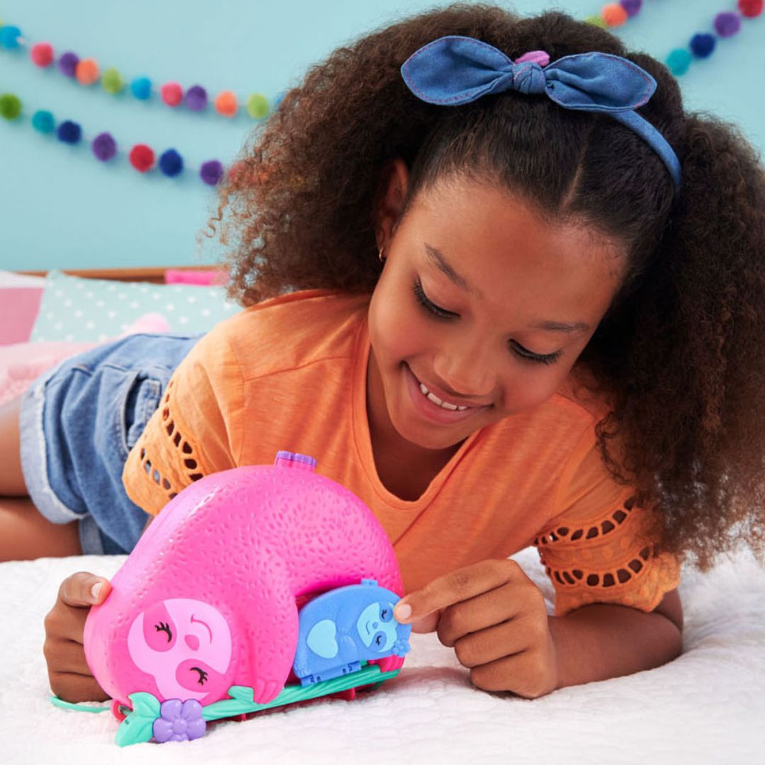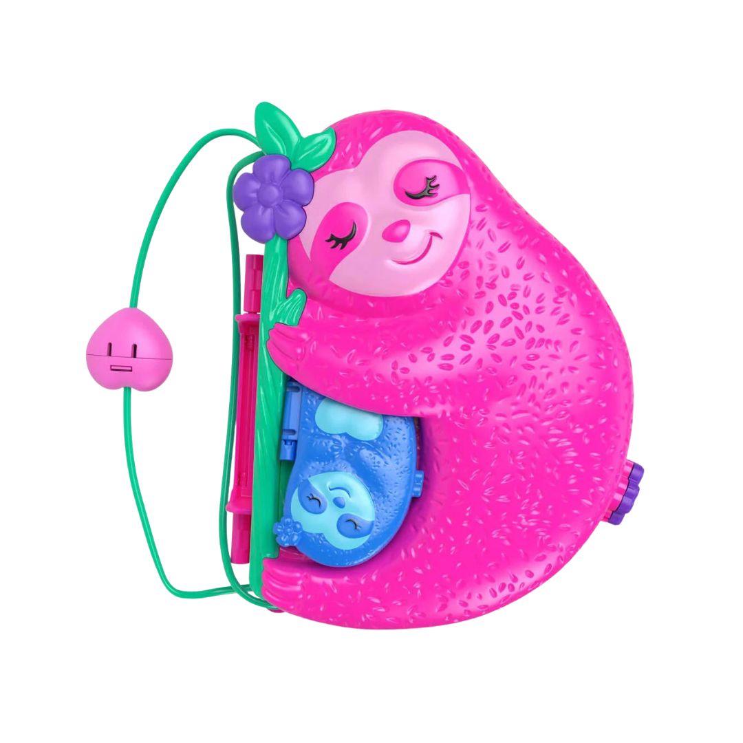 The Polly Pocket Sloth Family 2-in-1 Compact Playset offers an engaging and imaginative play experience. Shaped like a sloth with a baby sloth on its belly, this compact playset opens up to reveal vibrant tropical jungle-themed environments.