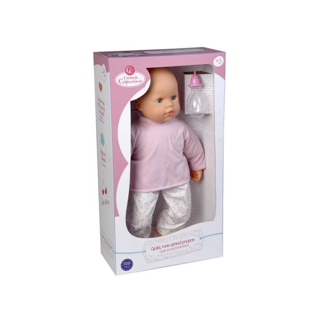 Cerise & Capucine My Grand Poupon Giulia is a soft and cuddly 48 cm doll designed to inspire nurturing play and imagination. With lifelike features and included accessories, Giulia encourages children to explore caregiving through pretend play.