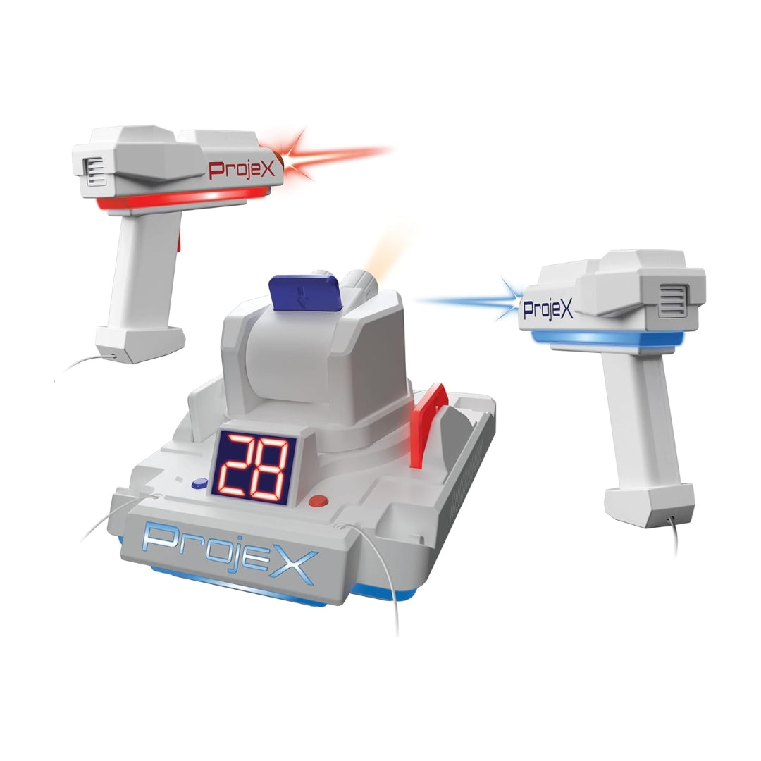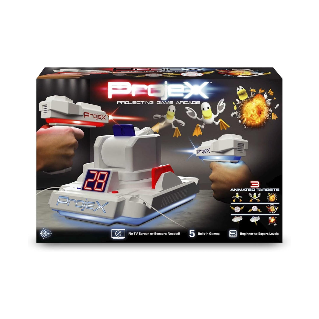 No TV, screens, or sensors needed just point ProjeX at a blank wall, grab your blaster, aim, and start shooting at the animated targets.