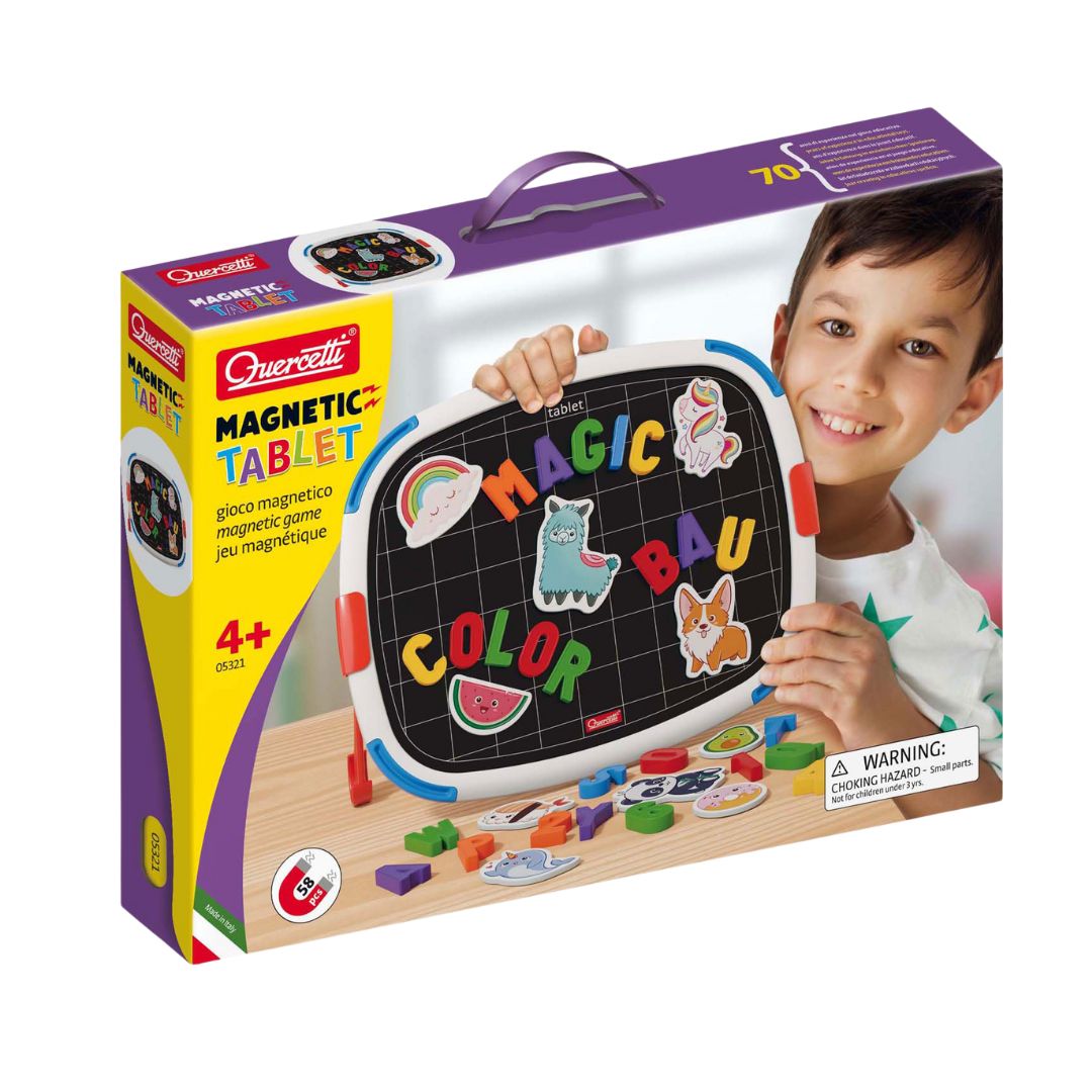 The Quercetti Magnetic Tablet Letters is an educational toy designed to help children compose their first words using illustrated magnetic tiles and plastic components.