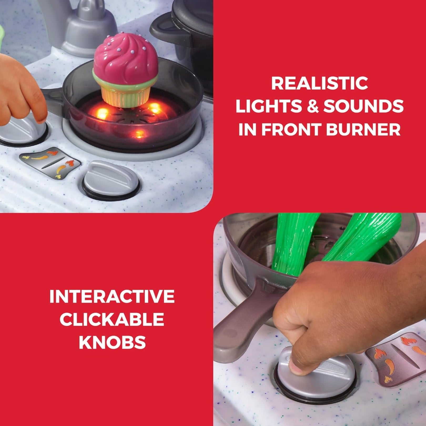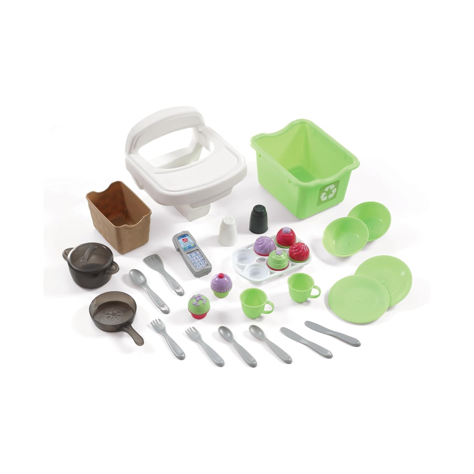 This realistic kids kitchen playset features a molded sink with faucet, granite-style countertop, microwave, refrigerator, and oven with working doors, plus generous storage for accessories. The open design and included play pieces encourage imaginative social play and sharing.