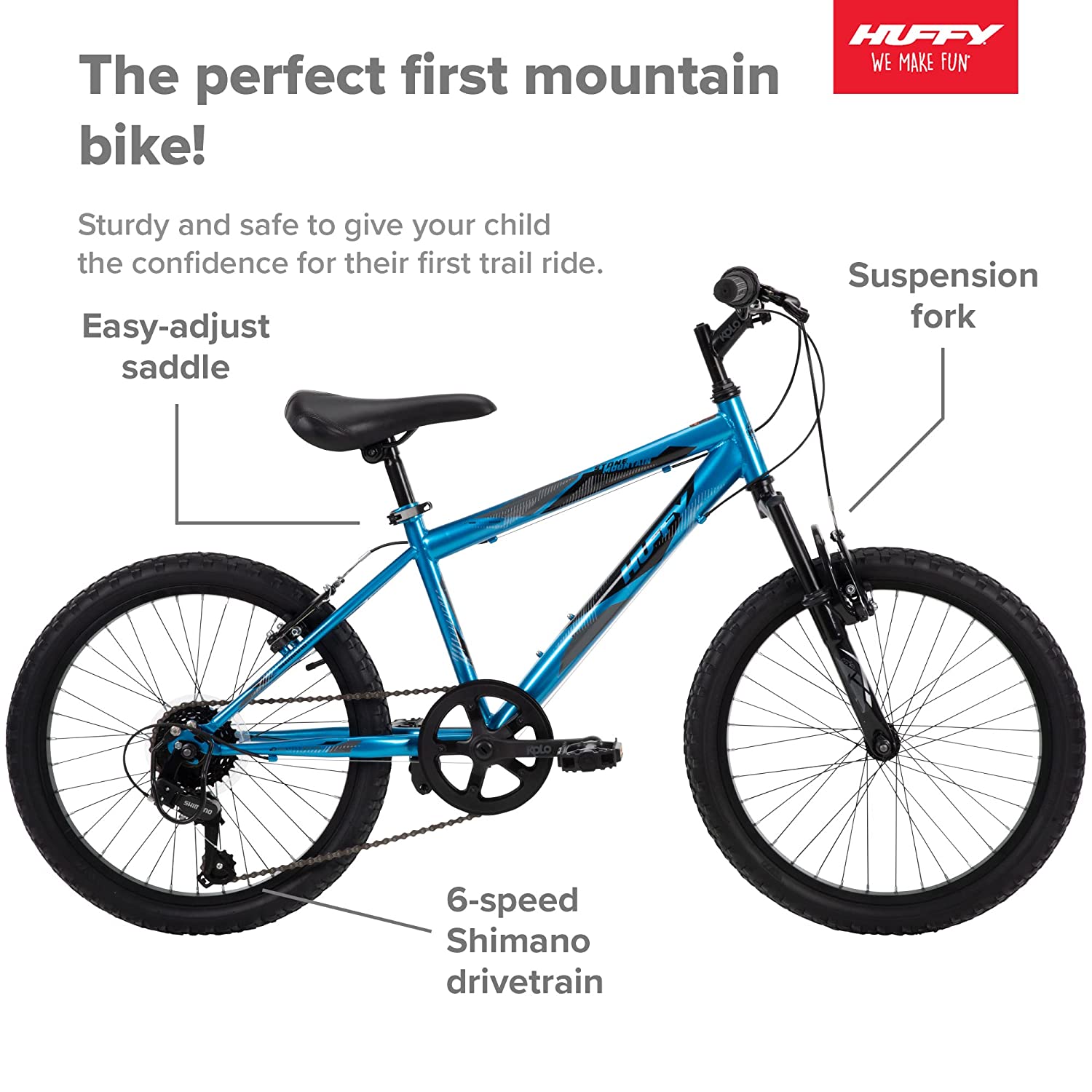 Sturdy steel frame with front suspension fork, 6-speed Shimano derailleur, and rugged and durable design with graphics and decals.