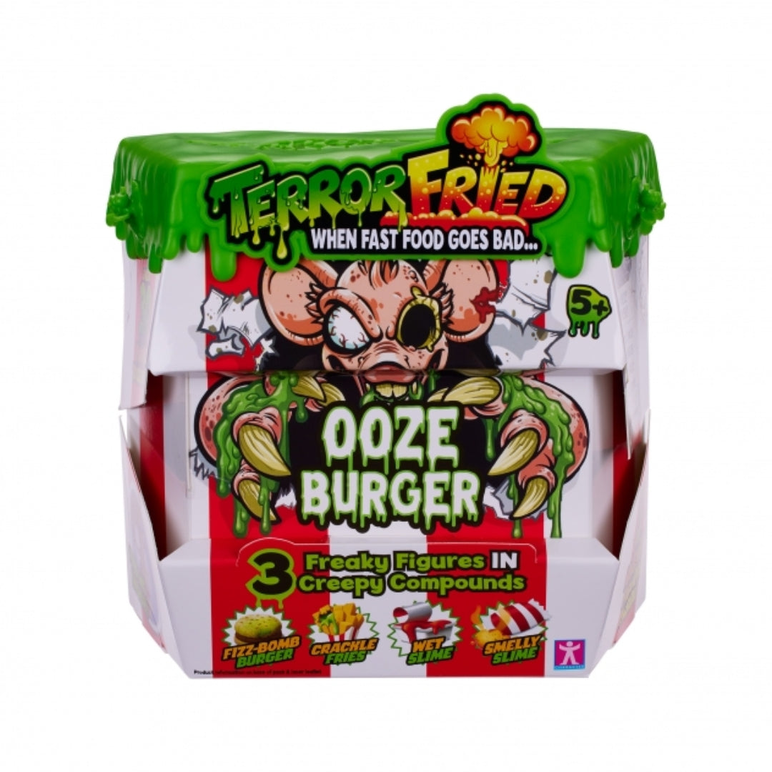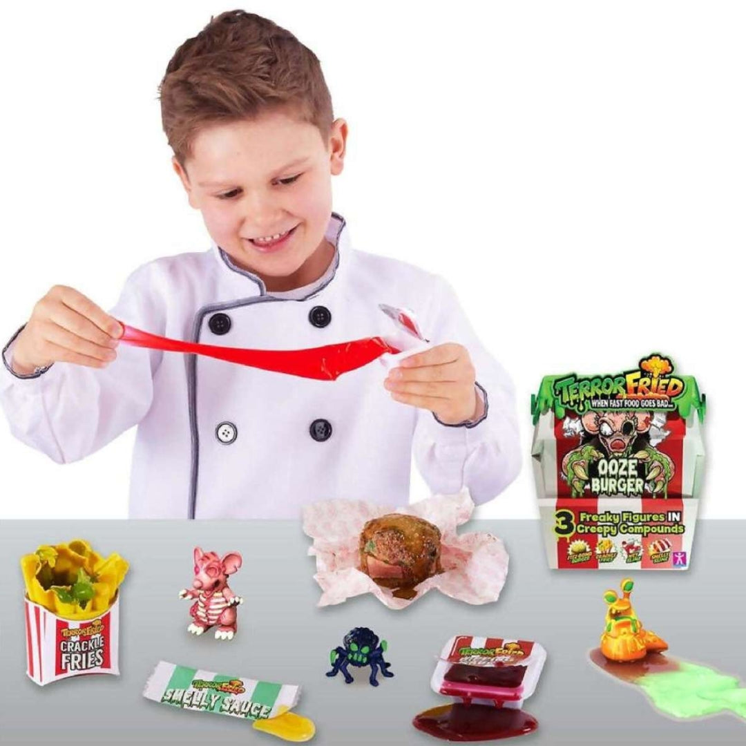 Get ready for a chilling play experience with Terror Fried The Horror Burger. This twist on a classic burger meal is loaded with creepy, gross surprises. Open the fast-food-style box to reveal a fizzing burger, crackling fries, and slimy dipping sauces.