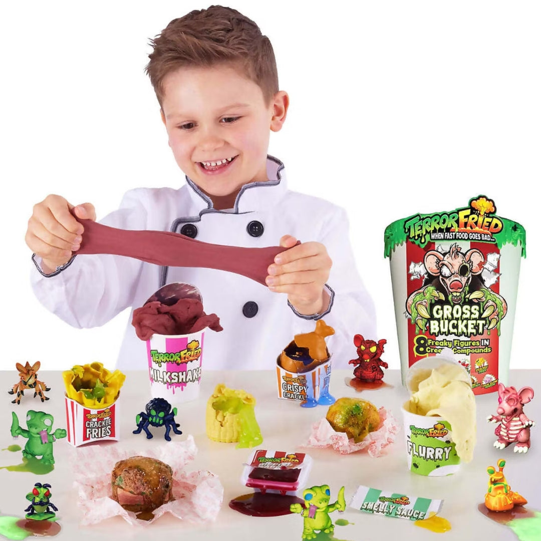 Terror Fried delivers the nastiest and creepiest critters pulled straight from the fry basket, ready to collect and enjoy. Each figure is concealed inside a different compound. Every set features a fizz-fry dissolving reveal at the core, supported by extra compounds that fizz, squish, crackle, or ooze.