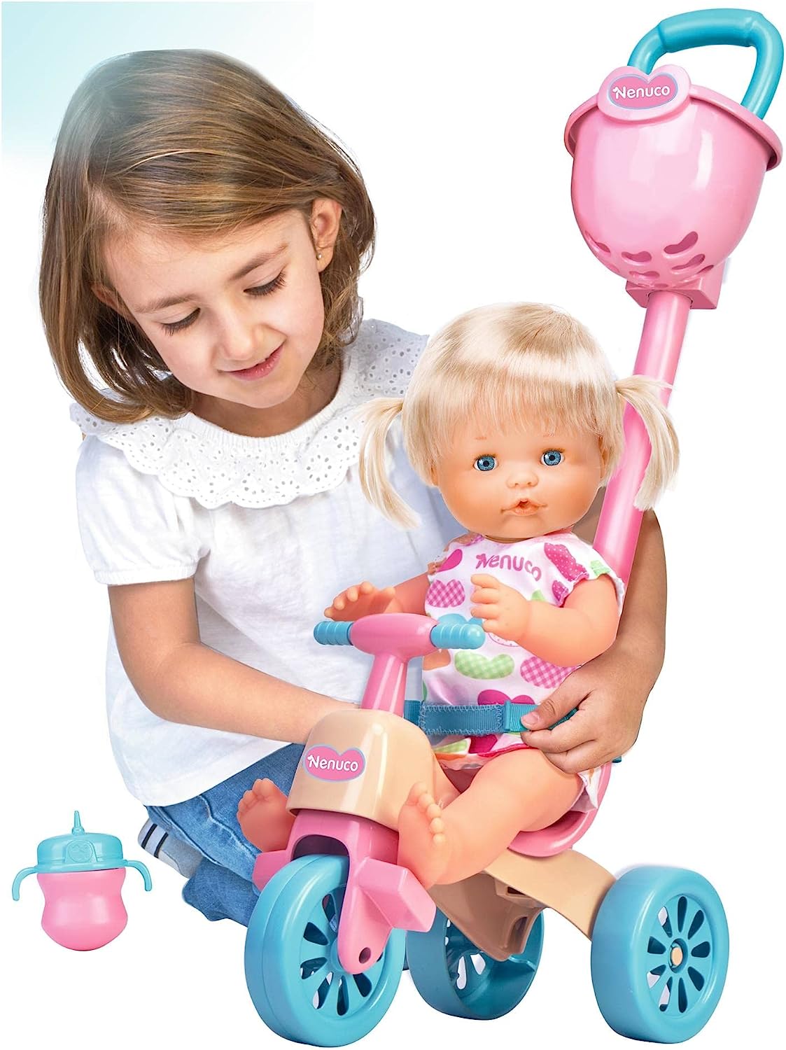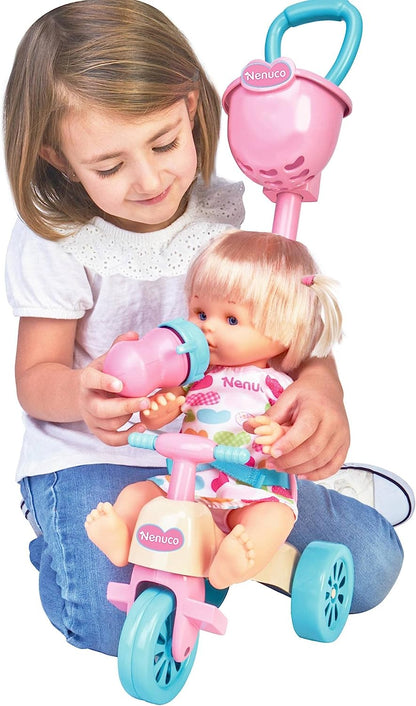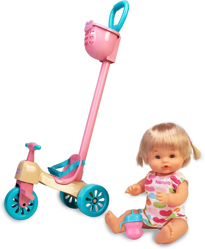 Nenuco and her Tricycle" is a toy set that features a blonde doll dressed in a cute outfit and a tricycle with an adorable pink, yellow, and blue pattern. The tricycle is designed for comfortable wearing and includes a wrist belt and wheels. It also comes with a handle for easy maneuvering. The set includes a removable basket for convenient storage and transportation of various items. Moreover, there are additional accessories included, such as Nenuco's diaper and bottle, to enhance the play experience.
